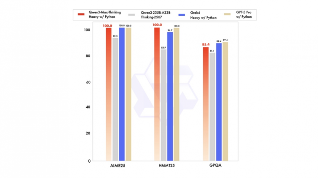 Qwen3-Max的推理增强版本Qwen3-Max-Thinking-Heavy也展现出非凡性能,结合工具调用和并行推理技术,其推理能力创下新高,尤其在聚焦数学推理的AIME25和HMMT测试中,均达到突破性的满分100分,为国内首次。Qwen3-Max推理模型之所以能够取得优异成绩,原因在于大模型在解数学题时懂得调动工具,能够写代码做题,同时,增加测试时的计算资源,也让模型表现变得更好。
