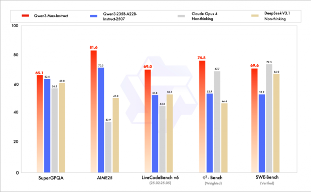 Qwen3-Max为通义千问家族中最大、最强的基础模型。该模型预训练数据量达36Ttokens,总参数超过万亿,拥有极强的Coding编程能力和Agent工具调用能力。在大模型用Coding解决真实世界问题的SWE-BenchVerified测试中,Instruct版本斩获69.6分,位列全球第一梯队;在聚焦Agent工具调用能力的Tau2-Bench测试中,Qwen3-Max取得突破性的74.8分,超过ClaudeOpus4和DeepSeek-V3.1。